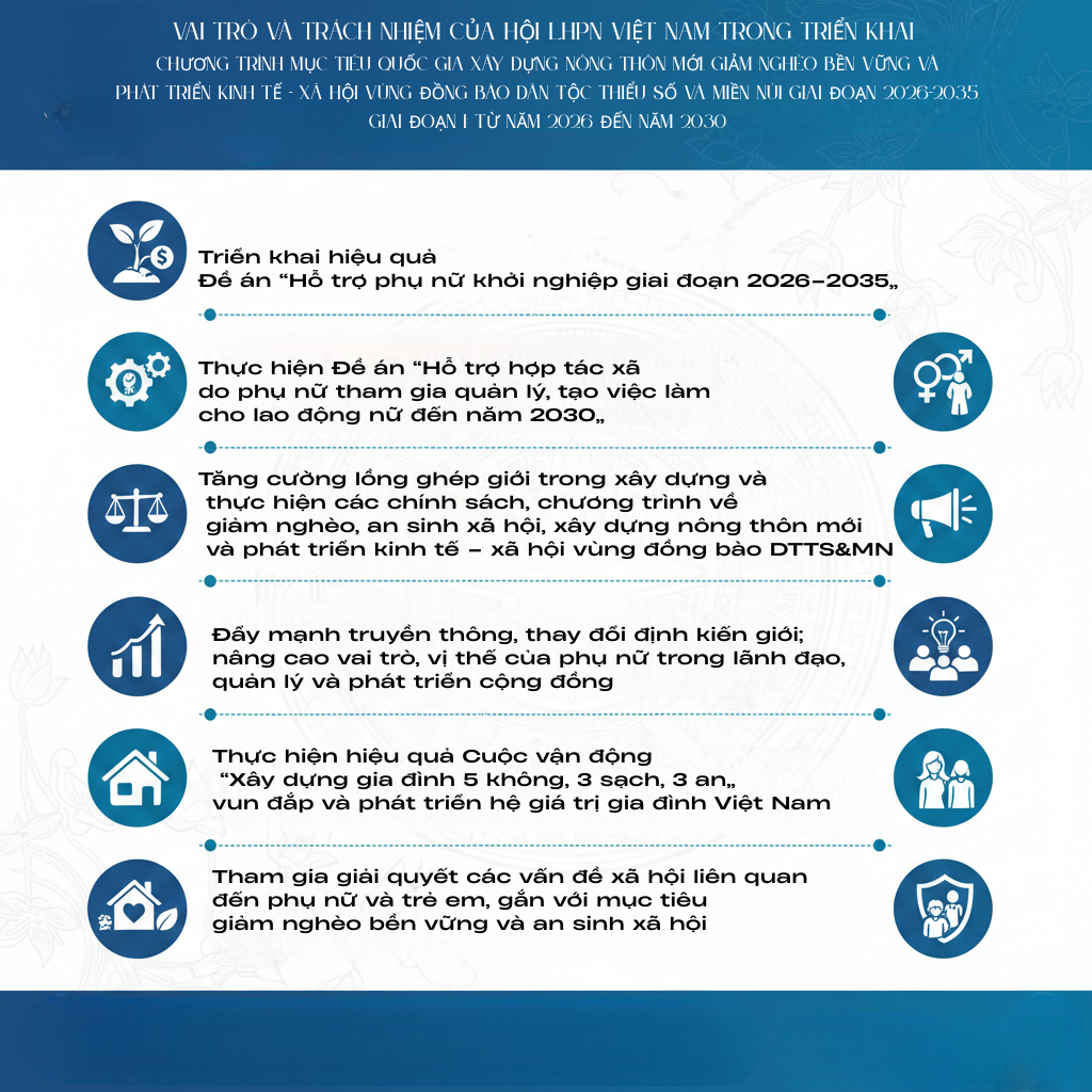 - Triển khai Đề án "Hỗ trợ phụ nữ khởi nghiệp giai đoạn 2026–2035". Theo đó, nhiệm của này tập trung vào hoạt động hỗ trợ phụ nữ nông thôn khởi sự kinh doanh, phát triển sinh kế, tham gia kinh tế số, kinh tế xanh, kinh tế tuần hoàn.